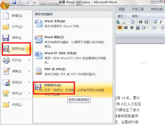 3、然后在“office按钮”的下拉菜单中依次点击“另存为/其他格式”。