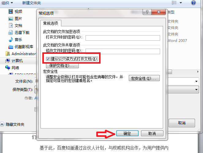 5、然后在“常规选项”的对话框中勾选“建议以只读方式打开文档”,再点击“确定”按钮。