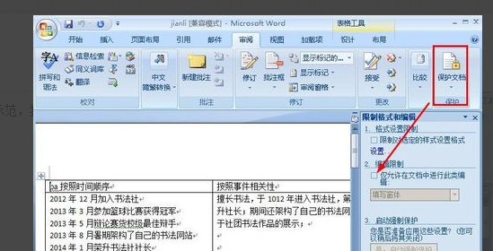 2,在界面的右上角选择保护文档,然后在对话框中勾选仅允许在文档中进行此类编辑。