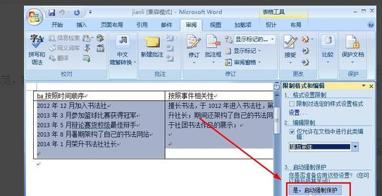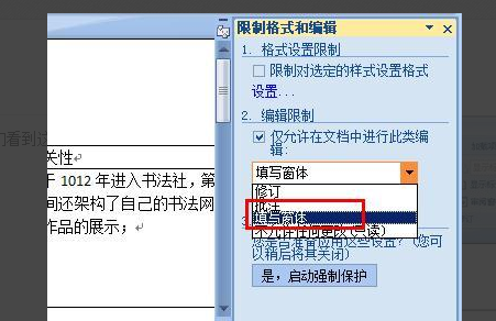 工具——保护文档——编制限制(右边窗口中第2条)——填写窗体(下拉表中选择)——启动强制保护(右边窗口中第3条)——输入密码(也可不输入,直接确定)——完成。