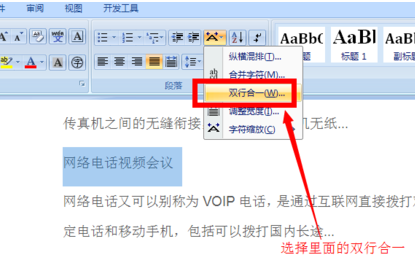 4、单击”中文版式“按钮,在弹出的下拉列表中选择”双行合一..."。将会弹出一个对话框。