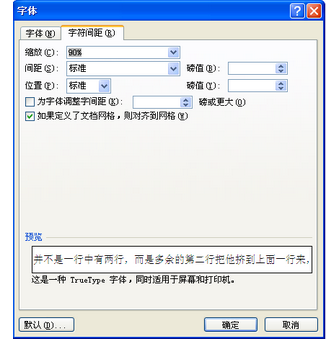 3、弹出字体对话框,选择字符间距选项卡,在缩放处选择90%即可,如图所示。