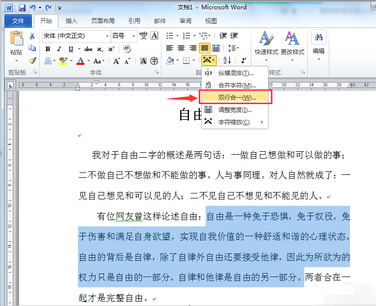 2、在一行中显示两行的文字,实际上就是利用word的“双行合一”功能。首先选中要设置成两行的文字。