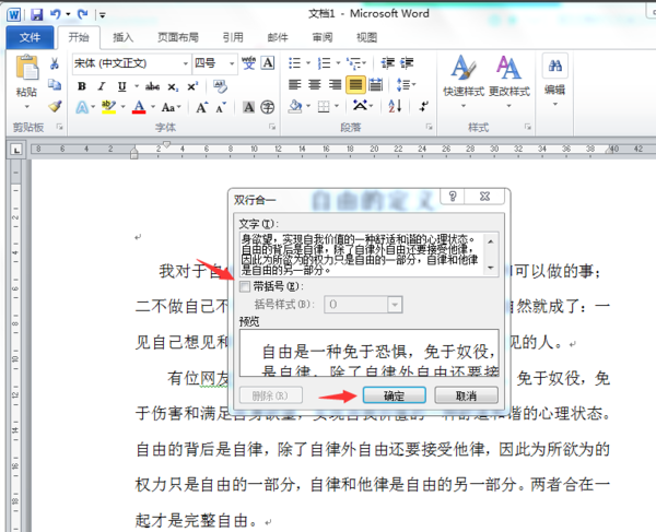 6、单击确定按钮后,关闭“双行合一”对话框,回到文档编辑状态,此时选中的文字就会按双行合一的效果显示。