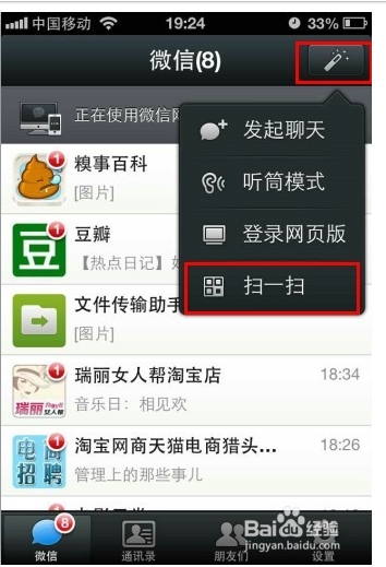 2、找到右上角的魔棒按钮,点击一下魔棒按钮,在显示出来的菜单中,找到“扫一扫”,点击;