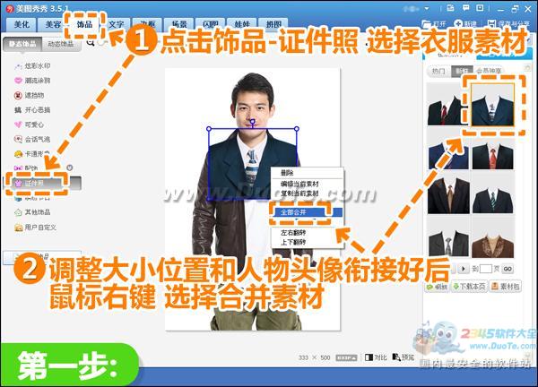 1、在“美图秀秀”下打开一张待处理的正面生活照,进入“饰品”菜单下,在“证件照”分类中选择适合自己的衣服素材,调节大小位置和人物衔接好后右键合并素材。