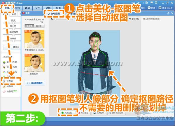 2、接着进入“美化”菜单下,点击“抠图笔”选择“自动抠图”,用抠图笔在人像部分划绿线确定抠图路径,不需要的部分用删除笔划掉,然后点击“完成抠图”。
