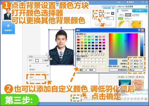 3、跳转到抠图换背景界面下,点击背景设置—颜色方块,在颜色选择器中选择背景颜色,也可以自定义背景色值,然后将前景羽化值调低后点击“确定”。