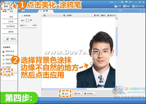 4、自动抠图后如果边缘有不自然的地方,可以点击“美化—涂鸦笔”,在涂鸦界面下,选择背景色的画笔来调整边缘。