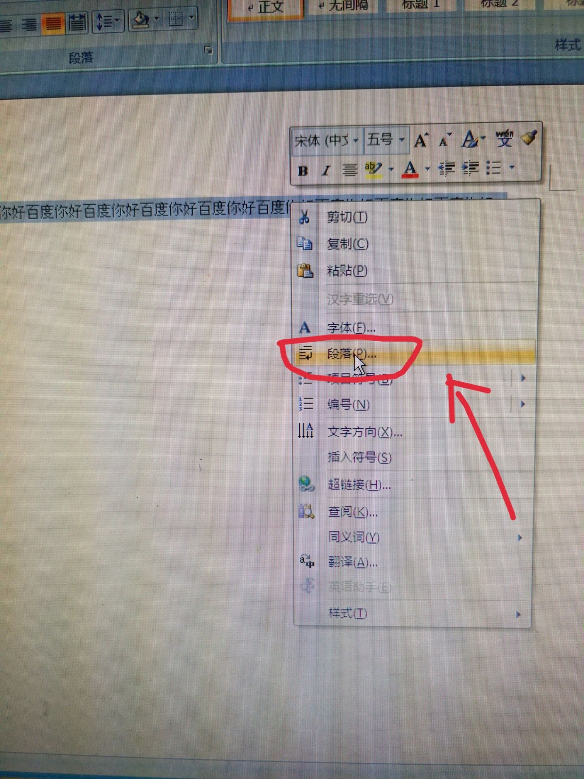 1、光标在段落上,右击鼠标,在弹出的框里选择“段落”。
