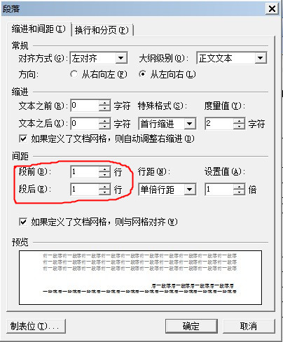 设置的效果:段前一行:就是你选择段落的上面多了一行空白;段后一行:就是选择段落的下面多了一行空白;