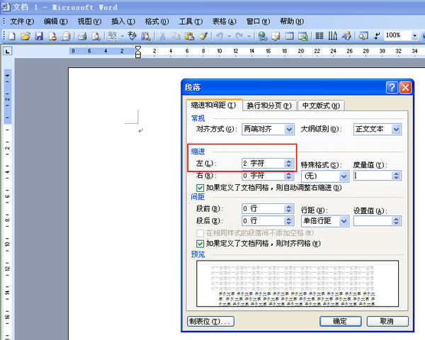 【左】选为2字符,因为中文每段文字的首行左边必须空两个字符。