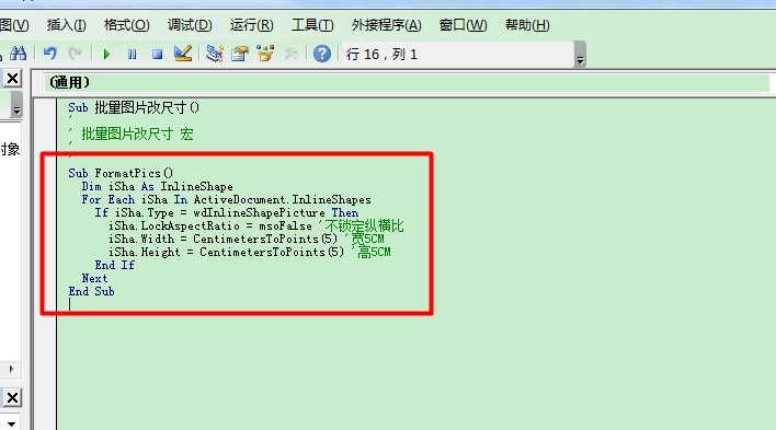 打开word,按下Alt+F8,出现宏界面,为新建的宏取名为AdjustPicWidthAndHeight 点击编辑按钮,输入下面红色字体标出的内容Sub AdjustPicWidthAndHeight()"" AdvertisePublishAs 宏" 将广告发布导出为 PDF 和 XPS"Sub setpicsize() "设置图片大小Dim n "图片个数On Error Resume Next "忽略错误For n = 1 To ActiveDocument.InlineShapes.Count "InlineShapes类型图片ActiveDocument.InlineShapes(n).LockAspectRatio = msoFalse "不锁定图片的纵横比 ActiveDocument.InlineShapes(n).Height = 320 "设置图片高度为 320pxActiveDocument.InlineShapes(n).Width = 425 "设置图片宽度 425pxNext nFor n = 1 To ActiveDocument.Shapes.Count "Shapes类型图片ActiveDocument.InlineShapes(n).LockAspectRatio = msoFalse "不锁定图片的纵横比ActiveDocument.Shapes(n).Height = 320 "设置图片高度为 320pxActiveDocument.Shapes(n).Width = 425 "设置图片宽度 425pxNext nEnd Subword批量修改图片大小——固定长宽篇这部分要说的是把word中的所有图片修改成固定的并且相同的长和宽!