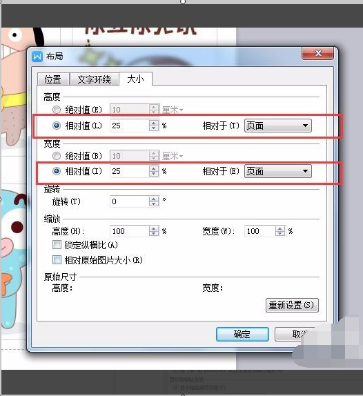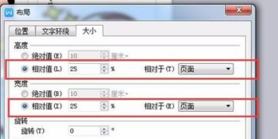 8、【布局】设置框中选择【大小】,这里高度和宽度的调整还可以根据页面的相对值来调整,即占页面的比例,这里我们输入25%