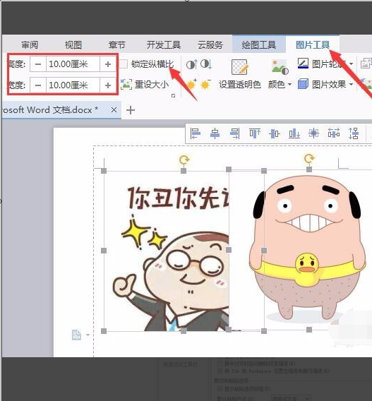 3、选择工具栏中的【图片工具】,下方可以直接输入高度和宽度进行大小调整,因为每张比例不同,所以锁定纵横比前面的勾勾要去掉。这里我们高度和宽度都输入10厘米。