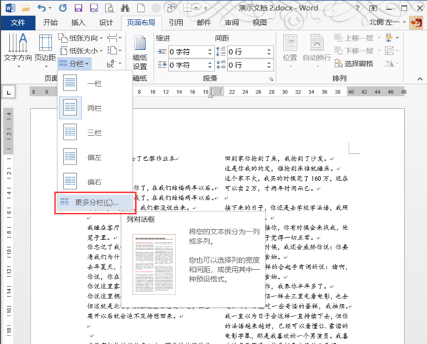 单击“页面布局”选项卡,在“页面布局”功能区中单击“分栏”按钮,打开一个下拉菜单,如下图所示,从中选择相应的栏数即可。
