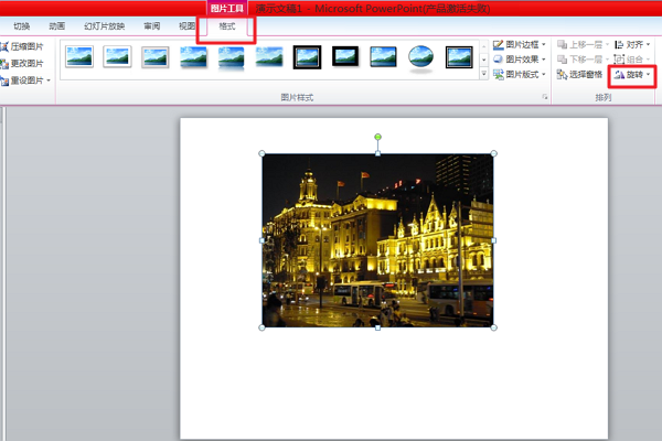 4、然后点击上方工具栏中的图片工具-格式,再点击旋转旁边的小箭头。