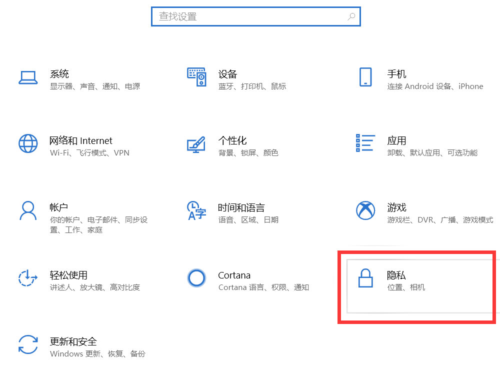 2、在设置窗口中点击“隐私”。
