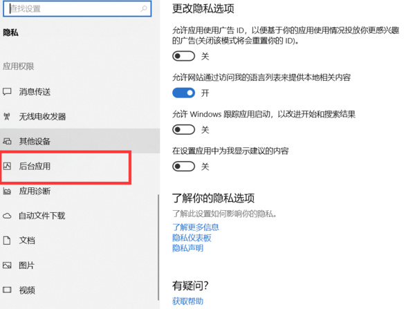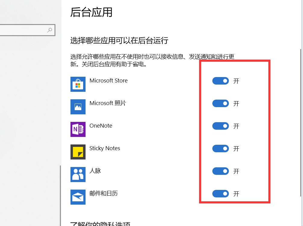 4、在背景应用中将打开的项关闭,这样便可以禁止它们在后台悄悄运行了。