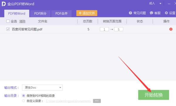 第二步,在PDF转Word对话框,拖动PDF格式文件进行添加到金山里边转换,设置转换的范围和保存的路径,设置完成点击开始转换即可进行操作。