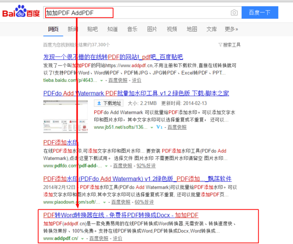 1、在浏览器中输入网址addpdf.cn,或者如下图所示在百度中搜索“加加PDF AddPDF”,并点击红色方框中的链接。