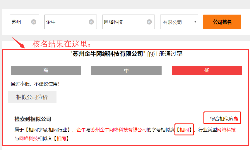 企二哥公司核名系统,功能简洁明了,操作简单方便,输入所取的公司名称,即可秒出结果,并会给出重名公司信息,以及相似的公司名称。如下图所示: