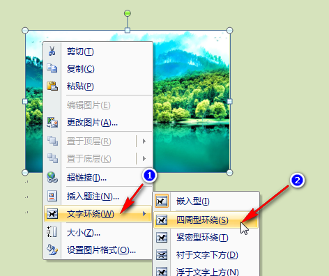 1、在WORD中插入图形或图片后,在图片上右键---文字环绕---四周型(除嵌入型均可)。