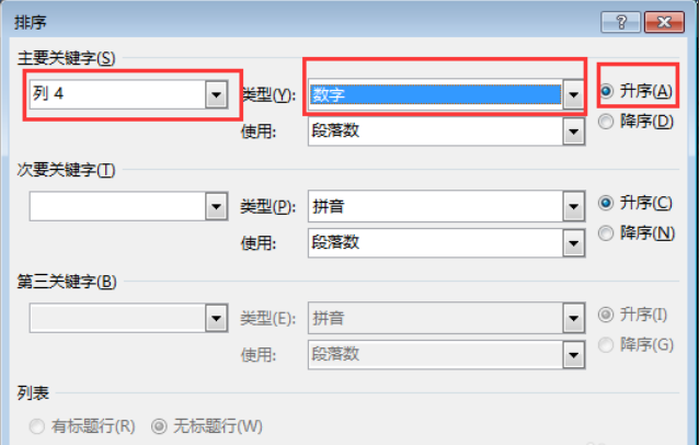 9、设置排序关键字,这里单击“面积”。在类型中单击“数字”。我们将根据表格中面积的数字大小进行排序。选择升序。单击确定。效果如下。