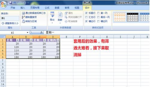 8、取消后的效果展示。说实话,套用的模板也不是十分的好看,但是,对于不会设计表格的人来说,通过套用,可以快速的节省时间达到一定程度具有一些美感的表格。而且会比一些新手设计的表格强很多。当没有设计表格的能力时候,不妨试试这种方法来帮助快速调整表格的面貌。