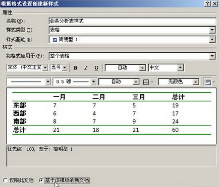 第2步,打开“根据格式设置创建新样式”对话框,在“名称”编辑框中输入新样式的名称,“样式类型”选择默认的“表格”选项。单击“样式基准”下拉三角按钮,选择最接近实际需要的Word2007内置表格样式。在“将格式应用于”下拉列表中选择“整个表格”选项,然后分别设置字体、字号、表格边框样式、边框颜色、底纹颜色等格式。完成格式设置后选中“基于该模板的新文档”复选框,并单击“确定”按钮。