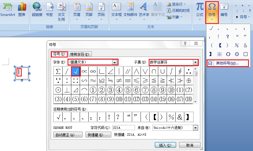 在弹出的“符号”对话框中将“子集”项选择为“数学运算符”,然后在下面就可以找到“勾”符号,选中后点击“插入”即可。