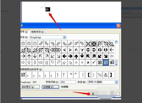 2、在弹出的“符号”对话框中将“字体”项选择为“Wingdings 2”,然后在下面就可以找到方框内打钩符号,选中后点击“插入”即可。