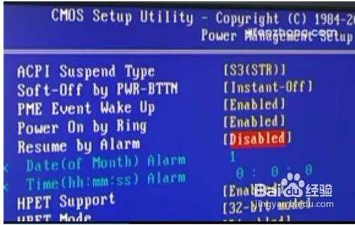 第二步:将光标移到“resume byalarm”项,用“page down”键将“disabled”改成“enabled”,此时“resume by alarm”选项下原本是灰色的日期和时间设置会变亮。