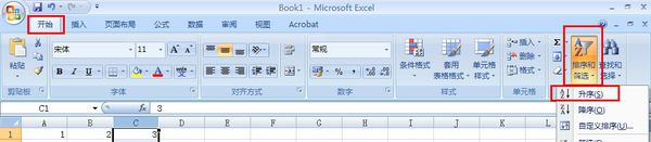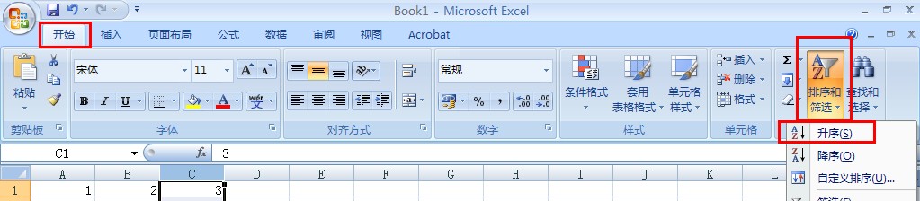 2、点击开始->排序和筛选,选择升序;