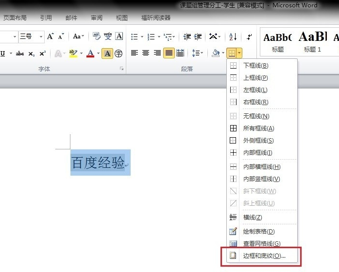 3、选中想要进行设置的文字段落,将鼠标移动到上方工具栏中,找到边框和底纹选项,点击。
