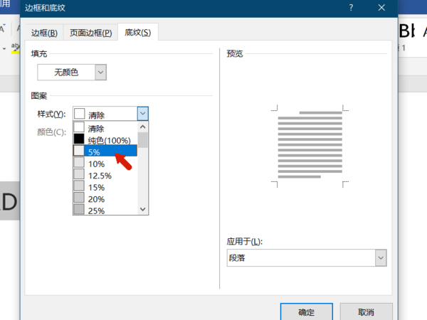 4、在边框和底纹窗口中,将选项卡调整到底纹选项卡,并设置图案样式为5%灰色。