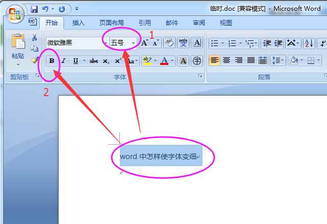 第一步首先选中字体 图中1表示调节字体大小 图中2表示调节字体粗细,如果字体本身是在加粗状态,则点击后变细(快捷键Ctrl+B) 如果原来未加粗则无法再变细,可以网上搜集相应字体的细型字体,没有则无法变细。