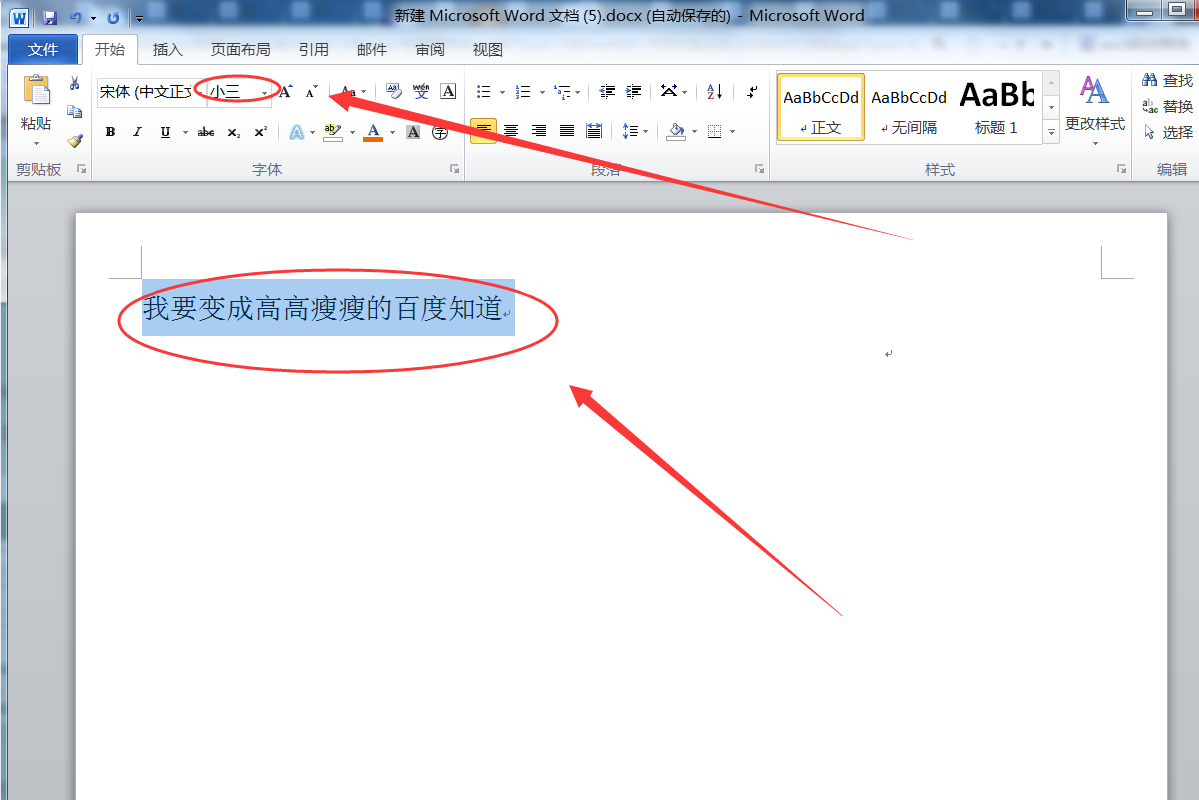 1、打开需要操作的WORD文档,选中需要调整得较高瘦的文本,在开始选项卡中找到字号,并选择一个较大的字号,使文本字体“变高”一些。