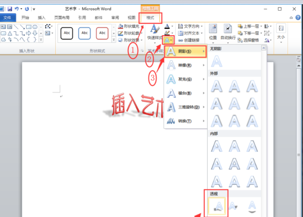 5、为了使标题立体一些,可以设置阴影。点击格式选项卡中的文字效果按钮,选择阴影中的右上对角透视