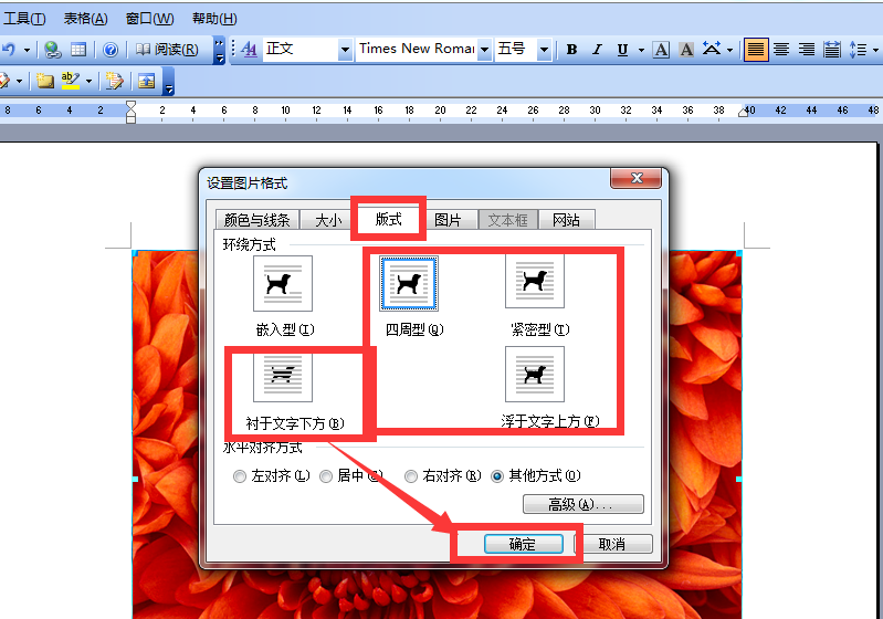 点击”版式“,选择非嵌入型的环绕方式,比如点击选中”衬于文字下方“,点击”确定“按钮;