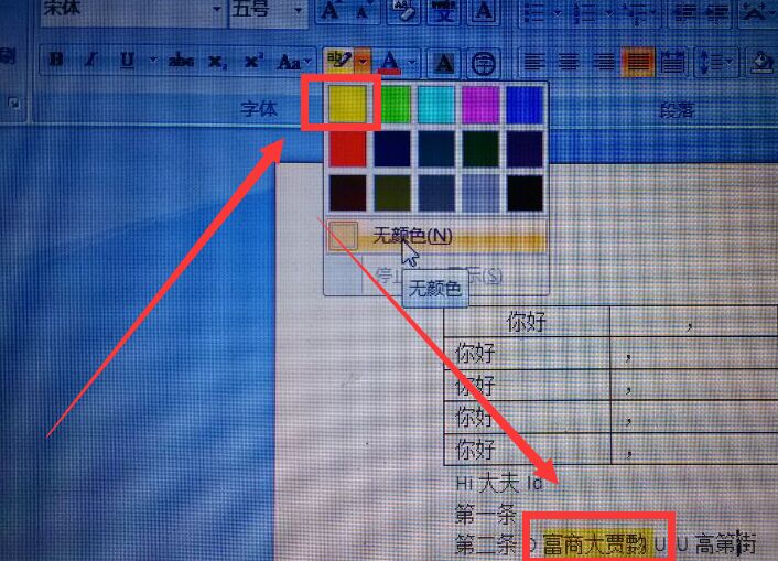 3、在工具栏点击“以不同颜色突出显示文本”按钮,选中需要的底色,选中的一行文字的底色就改变了。