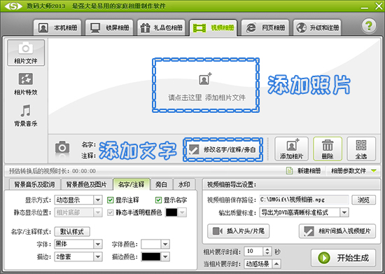 点击 视频相册 选项卡,导入照片即可,还可以插入视频短片做片头/片尾,点击 修改名字/注释/旁白 按钮,巧用文字特效功能为图片添加文字。加上自己喜欢的音乐,MTV动感歌词字幕方便你跟唱