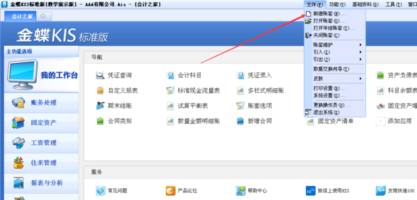 2、点击进去就是账套了,然后点击左上角主菜单的“文件”;