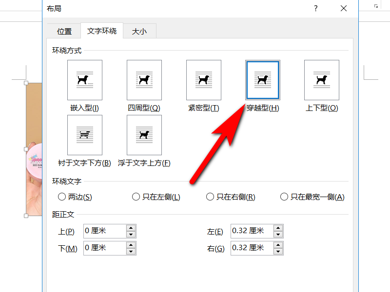 5、在跳出的布局工具栏中,选择文字环绕设置,选择环绕模式为穿越型方式,单击确认。