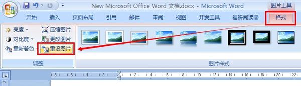 6、对图片进行各种编辑后,如果对设置不满意,可以在“格式”选项卡的“调整”区域点击“重设图片”按钮,将图片恢复至最初的状态,以便重新编辑。