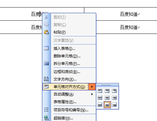 1、在word表格中的文章,设置单元格对齐方式,选择靠下居中对齐,如下图所示(并没效果),“百度知道”还是居中对齐的,原因是行距问题。