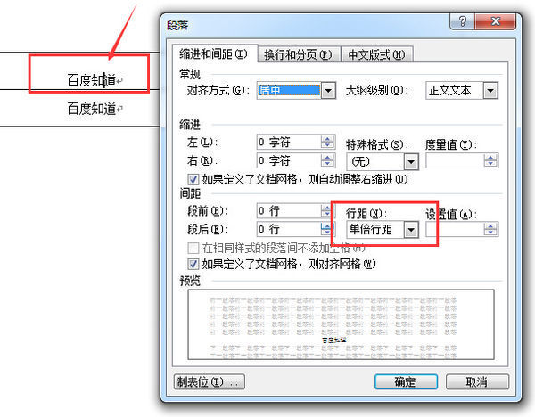 2、点击word菜单栏格式--段落,在段落窗口,修改下行距即可解决该问题;如图所示:修改为单倍行距后,“百度知道”靠下居中对齐设置就生效了。