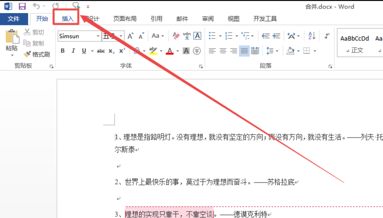 5.然后在打开的窗口中根据实际需要选择要合并的文档文件,选择好之后,点击 插入。