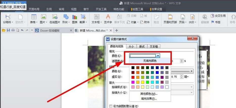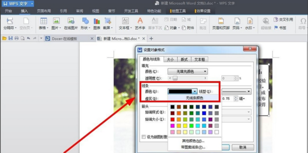 5,在”线条“一栏里面,点击”颜色“框右边的倒三角形,在弹出来的颜色选择窗口选择”无线条颜色“。
