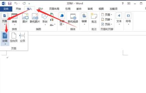 步骤二:在新建的空白Word文档编辑窗口,打开标题菜单栏的“插入”选项卡,然后再点击“页面”-->“封面”选项。如图所示;
